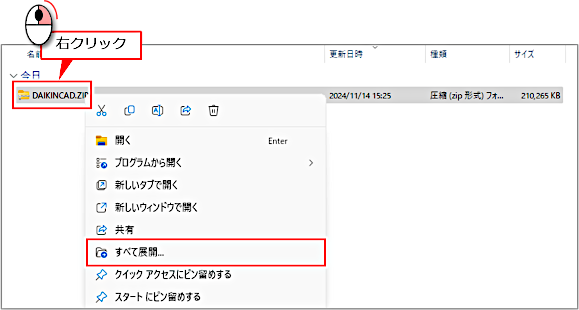 「DAIKINCAD.ZIP」ファイルを右クリックし、表示されたメニューから[すべて展開]をクリックします。
