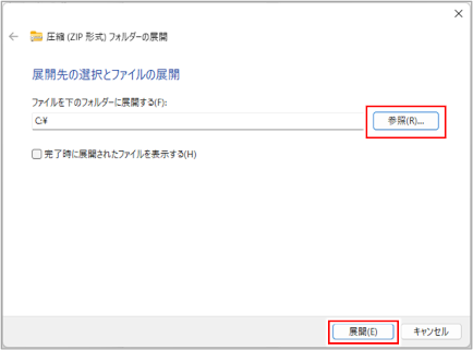 [参照]ボタンをクリックして展開先のフォルダを指定し、[展開]ボタンをクリックします。