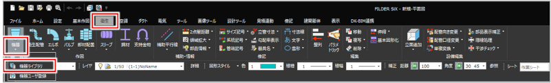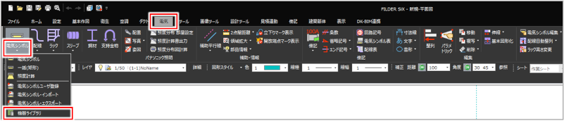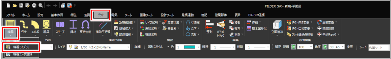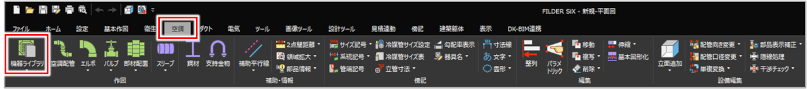 [衛生]タブ>[機器]プルダウンメニュー>[機器ライブラリ] [空調]タブ>[機器ライブラリ] [ダクト]タブ>[機器]プルダウンメニュー>[機器ライブラリ] [電気]タブ>[電気シンボル]プルダウンメニュー>[機器ライブラリ] |