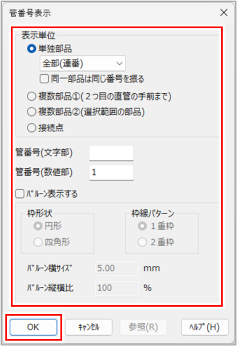 バルーンとして表示する場合、管番号は一括付加できません。1つずつ部品を選択し、バルーンを配置してください。 |