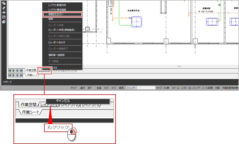 移動またはコピーするレイアウトのタブを右クリックし、メニューから[移動またはコピー]をクリックします。