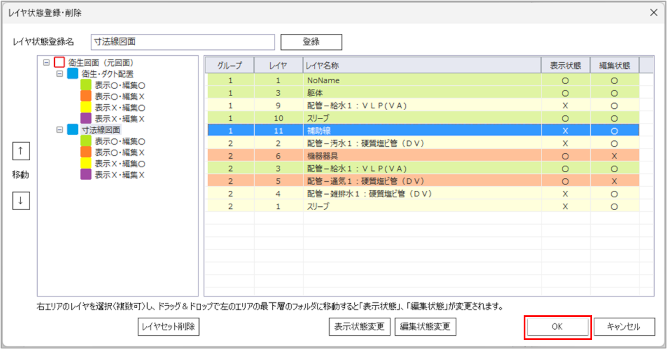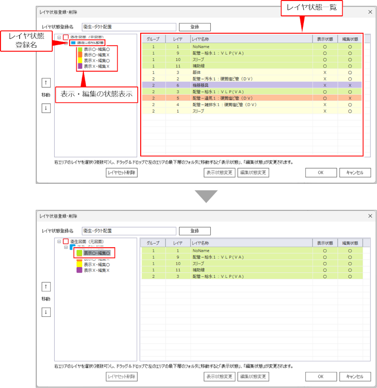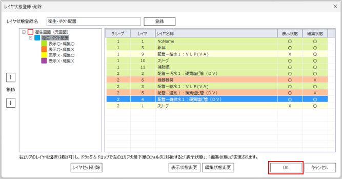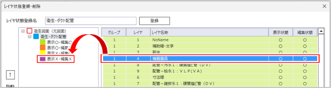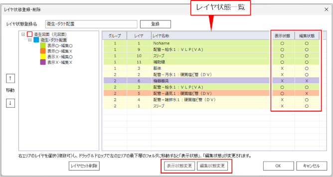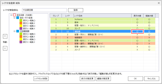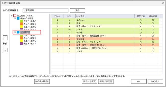 [レイヤ状態登録・削除]ダイアログの左側に、表示・編集の状態が表示されます。