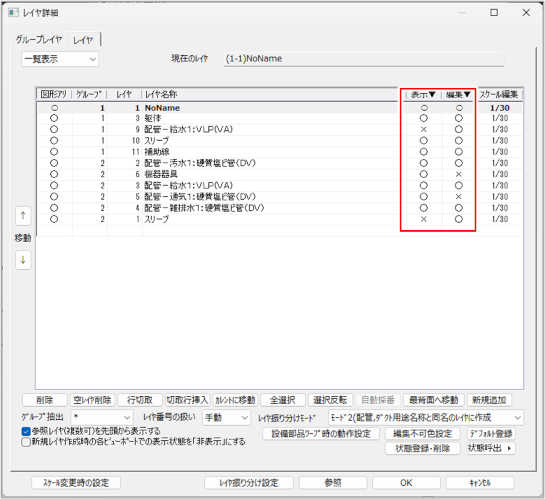 レイヤ状態一覧の[表示状態][編集状態]欄の[○][×]をクリックするか、または[表示状態変更][編集状態変更]ボタンをクリックし、表示・編集状態を変更できます。