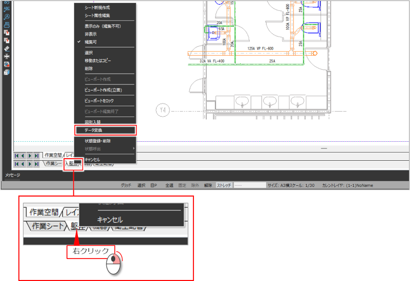 データ変換するシートのタブを右クリックし、メニューから[データ変換]をクリックします。