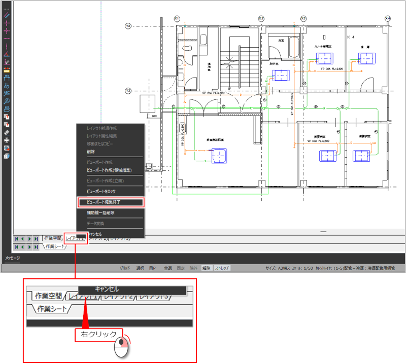 編集が終了したら、レイアウトのタブを右クリックし、メニューから[ビューポート編集終了]をクリックします。