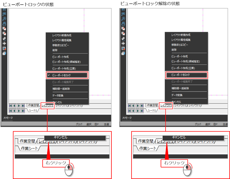 [レイアウト]タブを右クリックして、メニューから[ビューポートをロック]をクリックし、ビューポートのロック・ロック解除を切り替えます。