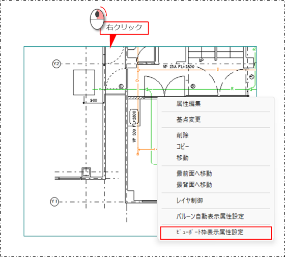 ビューポートを右クリックし、メニューから[ビューポート枠表示属性設定]をクリックします。