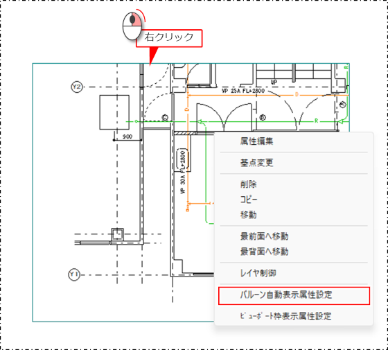 ビューポートを右クリックし、メニューから[バルーン自動表示属性設定]をクリックします。