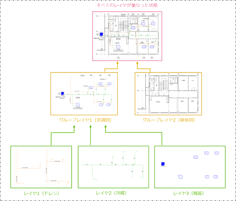 レイヤとは、図面を整理するための層のことです。この層は、透明な紙が重なっているようなイメージです。それぞれのレイヤには異なる図形を作図でき、図形を作図するレイヤを「カレントレイヤ」と呼びます。レイヤごとに表示・非表示や編集可・編集不可の制御ができます。 また、複数のレイヤをグループとしてまとめて、グループごとに表示・非表示や編集可・編集不可の制御ができます。