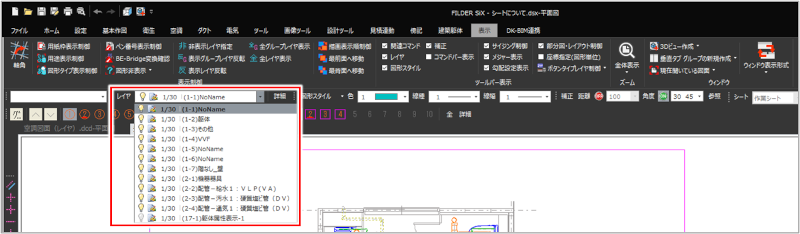 [レイヤ]ツールバーの▼をクリックすると、レイヤ一覧が表示され、カレントレイヤを変更できます。また、レイヤの表示・非表示や編集可・編集不可を変更できます。