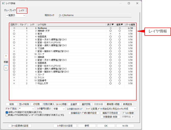 [レイヤ]タブをクリックすると[レイヤ詳細]ダイアログが表示されます。