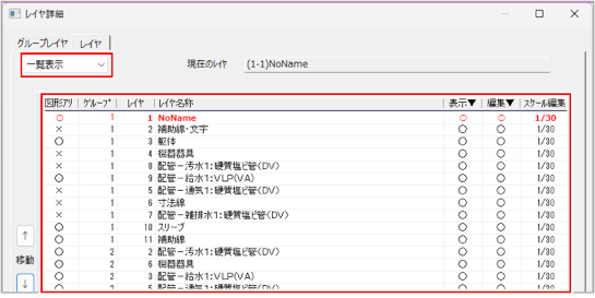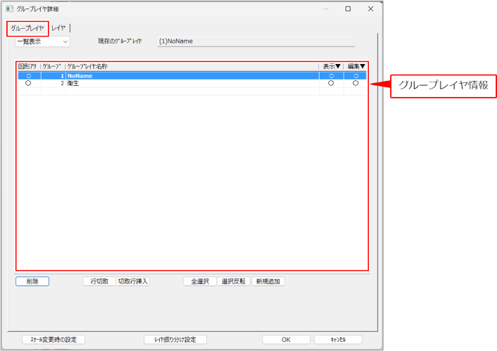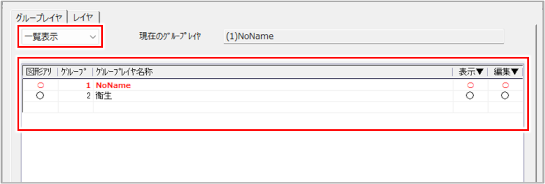 図形の有無が[〇][×]で表示されます。 クリックすると、カレントグループレイヤに切り替わります。 |
