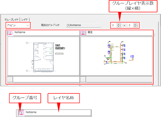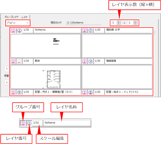グループ番号が表示されます。 一覧表示のとき、ダブルクリックするとグループ番号を変更できます。 プレビュー表示のとき、クリックすると、カレントグループレイヤに切り替わります。 プレビュー表示のときの表示内容について、詳しくは以下を参照してください。 |