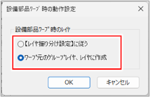 設備部品をワープする場合のレイヤ振り分け方法を設定するときにクリックします。クリックすると、[設備部品ワープ時の動作設定]ダイアログが表示されます。