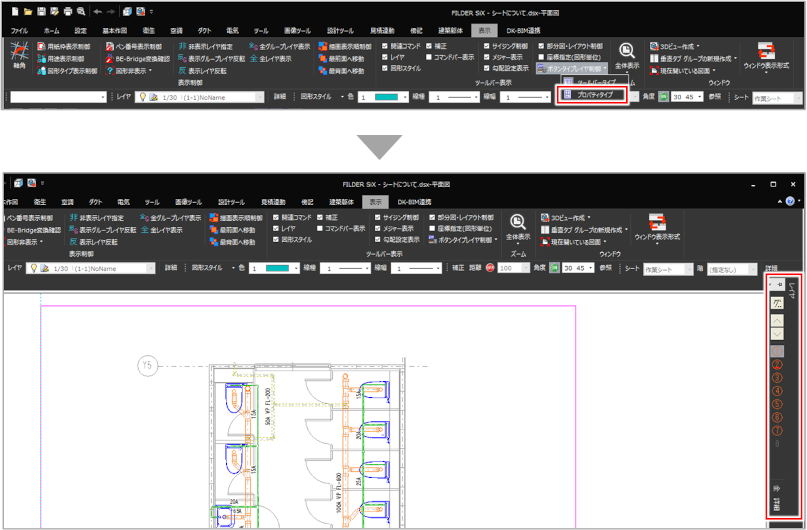 リボンメニューの[表示]タブで[ボタンタイプレイヤ制御]プルダウンメニューから[プロパティタイプ]コマンドをクリックすると、プロパティタイプのボタンタイプレイヤが表示されます。