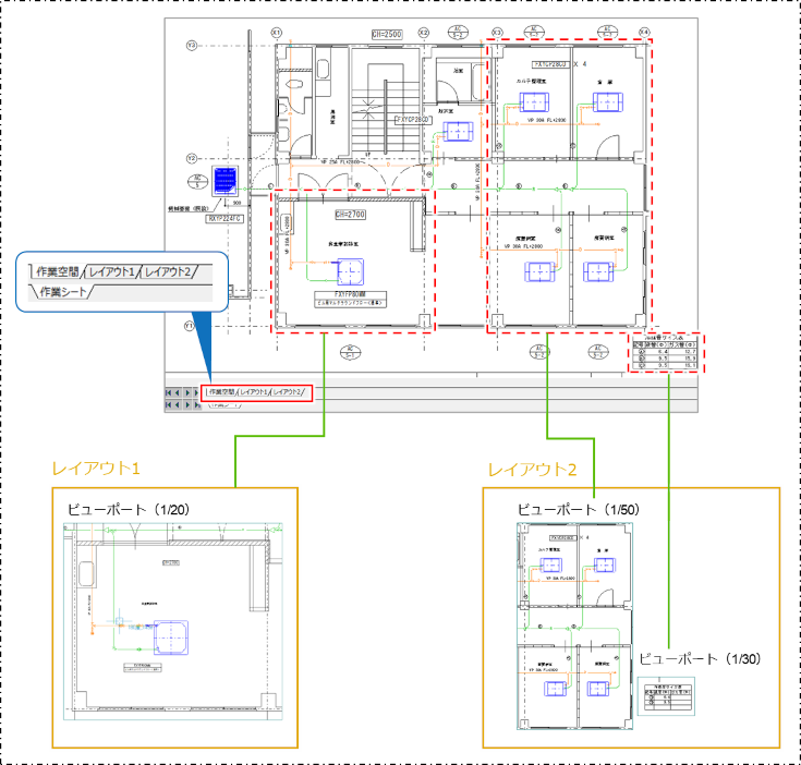レイアウトは、作業空間の一部をビューポートで抜き出して配置し、印刷イメージを作成する空間です。1つのファイルに複数作成できます。