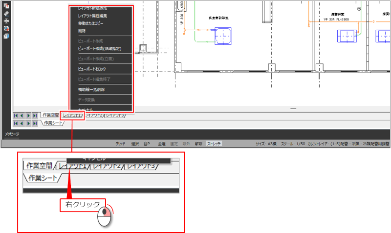 レイアウトのタブを右クリックすると、メニューが表示されます。メニューをクリックして、レイアウトの新規作成や属性編集、移動・コピー、ビューポートの作成などの操作ができます。