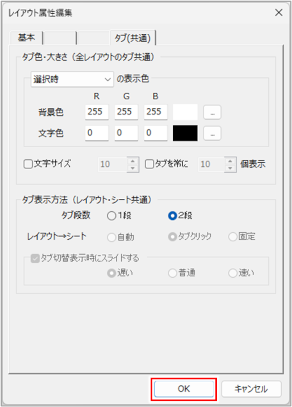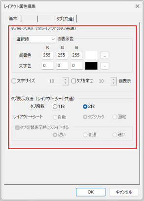 レイアウトのタブを選択したときのタブの色を設定します。 数値を直接入力するか、または[...]をクリックして色を選択し、[背景色][文字色]を設定します。 |