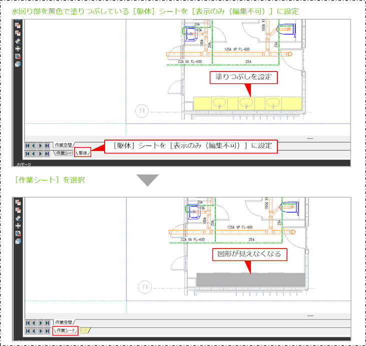 この場合、編集不可シートの塗りつぶし色や透過率を変更することで、[作業シート]で図形が見えるようにできます。