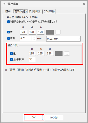 編集不可のシートに塗りつぶしがある場合、編集不可色設定により線と塗りつぶしが同じ色になるため、塗りつぶしの色や透過率を異なる設定にできます。