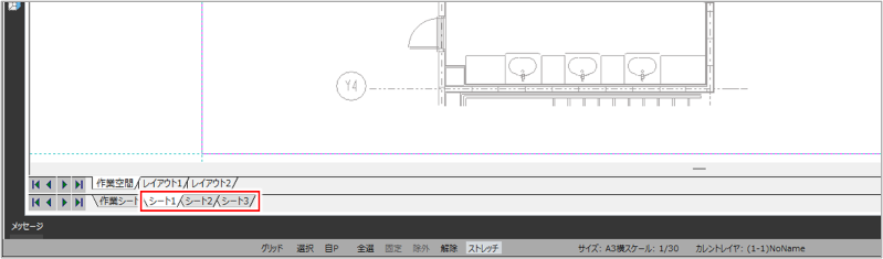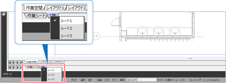 グループシートタブをクリックし、グループ内のシート名からカレントシートを選択できます。