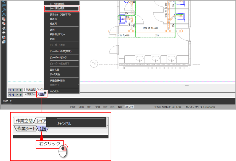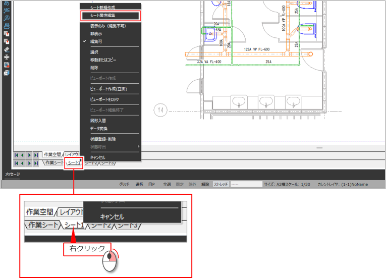 選択したシートのタブを右クリックし、メニューから[シート属性編集]をクリックします。