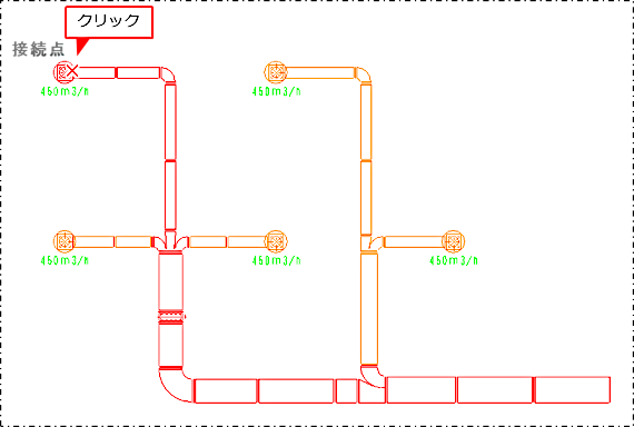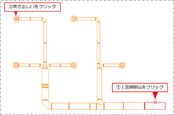 ダクト経路の始点(上流部品)と終点(吹き出し口)から、その経路の圧損計算を行います。ここでは、例として吹き出し口が付いたダクト経路で計算します。