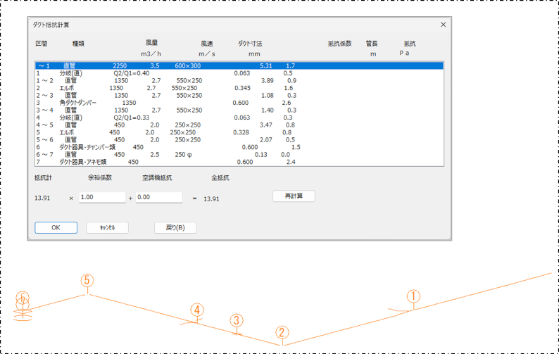 [ダクト抵抗計算]ダイアログの[OK]ボタンをクリックします。
