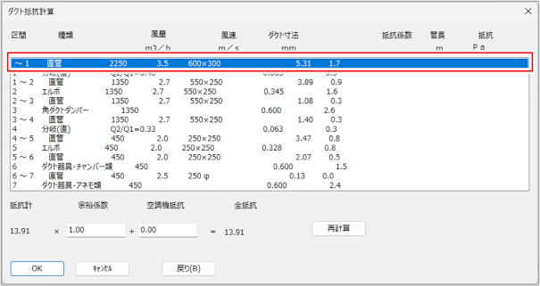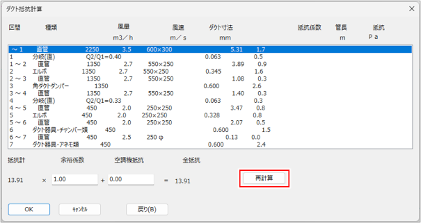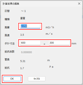 変更内容が[ダクト抵抗計算]ダイアログに反映されます。