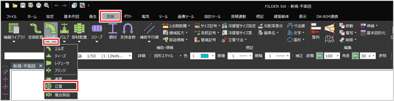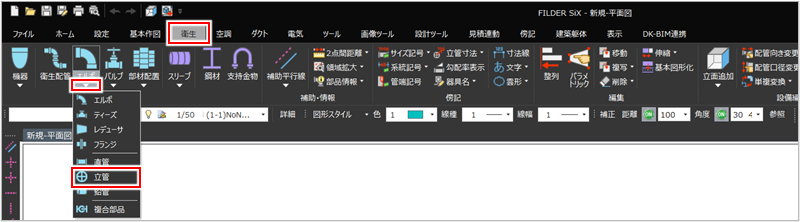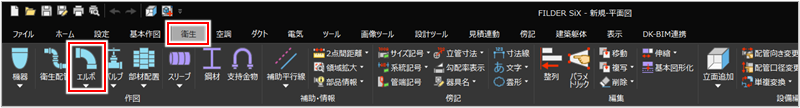 [衛生]タブ>[エルボ]プルダウンメニュー>[立管] [空調]タブ>[エルボ]プルダウンメニュー>[立管] |