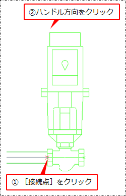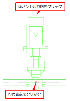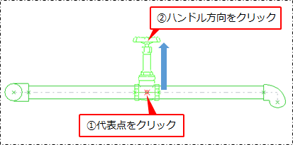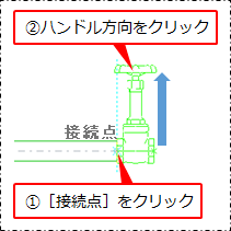 バルブを挿入する配管上の代表点、または配管の[接続点]をクリックし、ハンドル方向をクリックします。