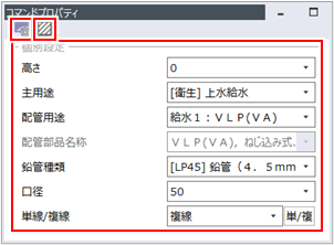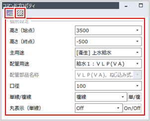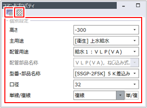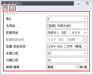 [高さ][主管口径]は接続部品の接続点をクリックすることで自動的に設定されます。[付属口径]は入力が必要です。