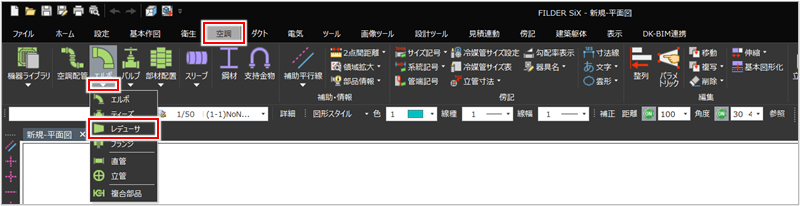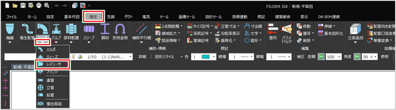 [衛生]タブ>[エルボ]プルダウンメニュー>[レデューサ] [空調]タブ>[エルボ]プルダウンメニュー>[レデューサ] |