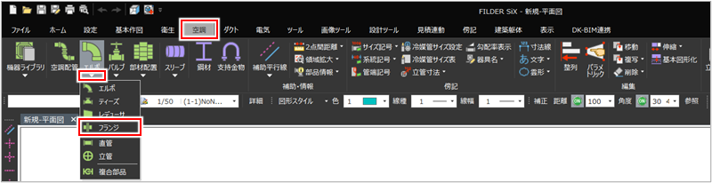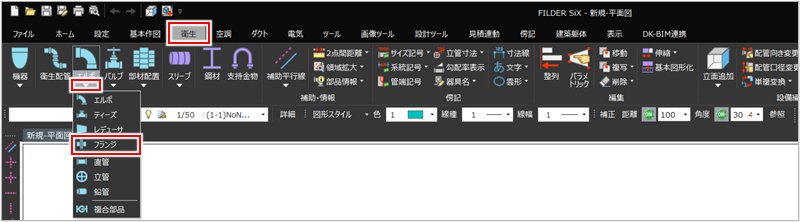[衛生]タブ>[エルボ]プルダウンメニュー>[フランジ] [空調]タブ>[エルボ]プルダウンメニュー>[フランジ] |