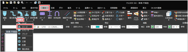 [衛生]タブ>[エルボ]プルダウンメニュー>[ティーズ] [空調]タブ>[エルボ]プルダウンメニュー>[ティーズ] |