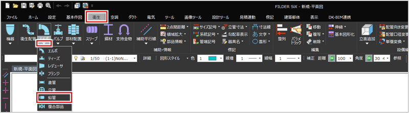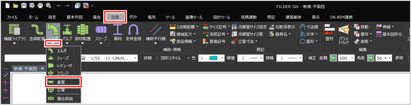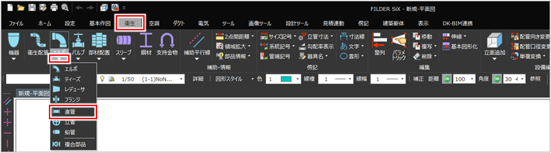 [衛生]タブ>[エルボ]プルダウンメニュー>[直管] [空調]タブ>[エルボ]プルダウンメニュー>[直管] |