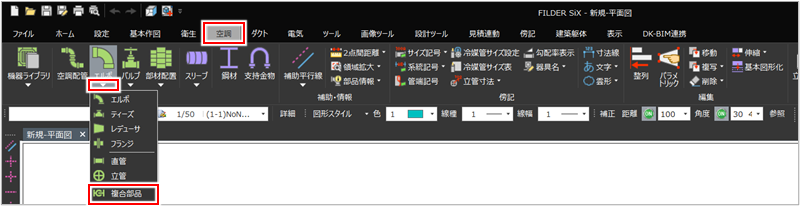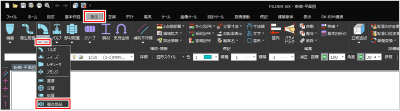 [衛生]タブ>[エルボ]プルダウンメニュー>[複合部品] [空調]タブ>[エルボ]プルダウンメニュー>[複合部品] |
