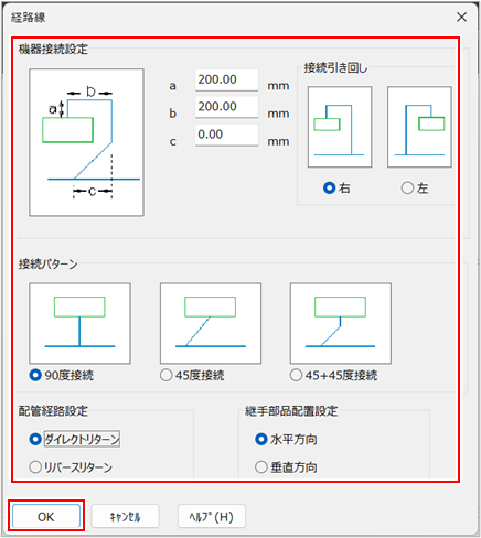 指定する経路線への接続部分のパターンを選択します。 [45度接続][45+45度接続]を選択した場合の45°経路線の向きは、指定する経路線の流れ方向と主用途により決定します。 |