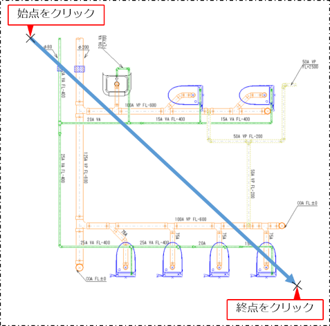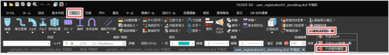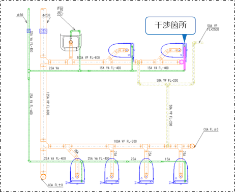 [衛生]タブ>[干渉チェック]プルダウンメニュー>[干渉箇所確認] [空調]タブ>[干渉チェック]プルダウンメニュー>[干渉箇所確認] |