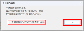 次回以降[干渉箇所確認]ダイアログを表示しない場合は、[次回以降はこのダイアログを表示しない。]にチェックを付けます。