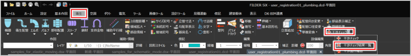 [衛生]タブ>[干渉チェック]プルダウンメニュー>[干渉チェック結果一覧] [空調]タブ>[干渉チェック]プルダウンメニュー>[干渉チェック結果一覧] |