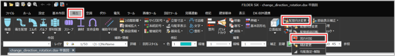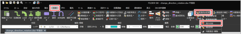 [衛生]タブ>[配管向き変更]プルダウンメニュー>[流れ付加] [空調]タブ>[配管向き変更]プルダウンメニュー>[流れ付加] |
