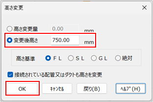 [変更後高さ]を選択して、変更後の高さを入力し、[OK]ボタンをクリックします。
