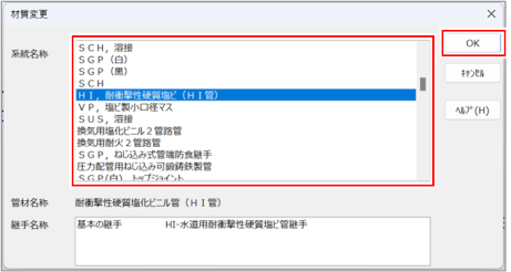[系統名称]で変更後の配管の材質を選択し、[OK]をクリックします。