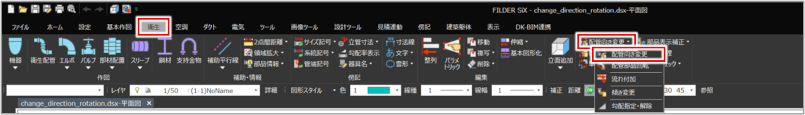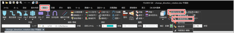 [衛生]タブ>[配管向き変更]プルダウンメニュー>[配管部品回転] [空調]タブ>[配管向き変更]プルダウンメニュー>[配管部品回転] |