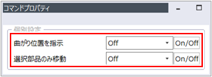 伸縮移動する部品の途中に曲がり位置を指定する場合は、[On]を選択します。[On/Off]ボタンをクリックすると、[On]と[Off]が交互に切り替わります。 [選択部品のみ移動]を[On]にした場合は、指定した曲がり位置から前後の部品を発生して伸縮移動します。 |