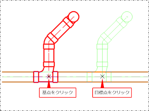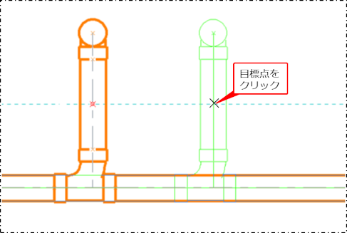 選択した部品のみを伸縮移動する場合は、[On]を選択します。[On/Off]ボタンをクリックすると、[On]と[Off]が交互に切り替わります。 本項目を[On]にして伸縮移動した場合は、選択した部品の前後の部品は移動せずに、選択した部品と前後の部品をつなぐ直管や継手が発生します。 |
