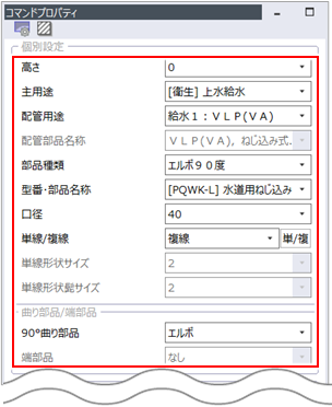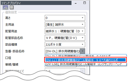 [コマンドプロパティ]の[型番・部品名称]から継手を選択します。