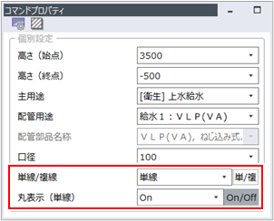 [丸表示(単線)]を[On]にしても丸表示が表示されない場合は、[配管設定]ダイアログの[単線/複線]で[立管(単線)丸表示する]にチェックを付けます。[配管設定]ダイアログの設定について、詳しくは以下を参照してください。