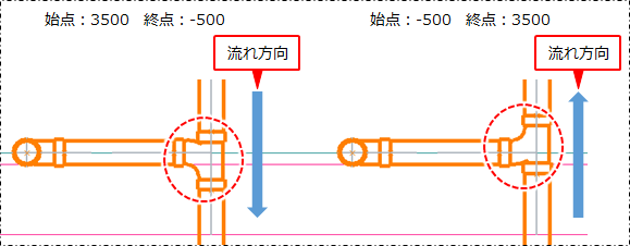 立管に枝管を作図した場合に立面で表示すると、ティーズの向きは、デフォルト設定では立管の始点から終点の流れ方向に表示されます。配管の流れ方向のデフォルト設定について、詳しくは以下を参照してください。